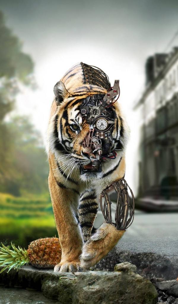 Wallpaper Tiger at the intersection of nature and civilization, steampunk