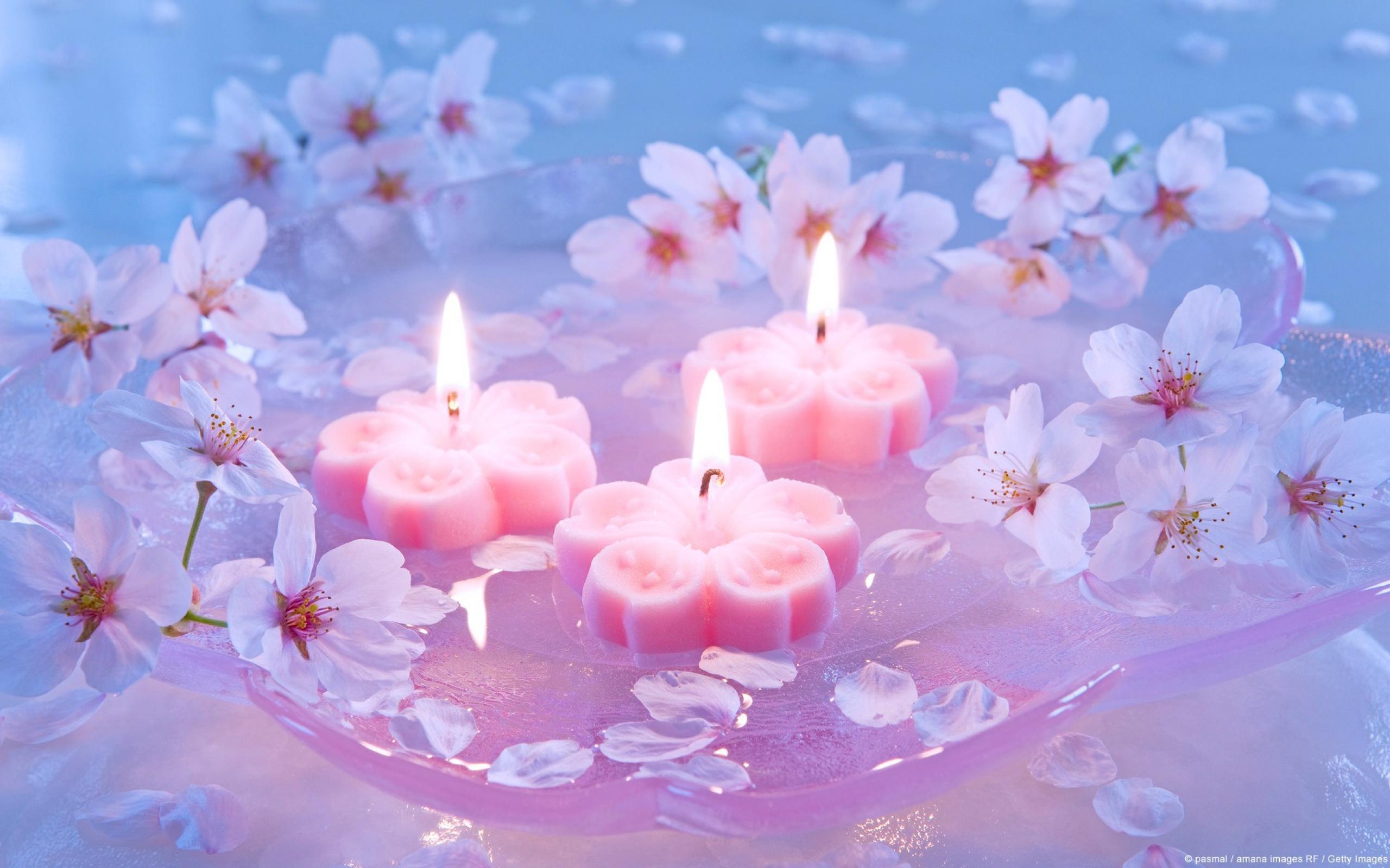 Wallpaper Burning candles among the flowers