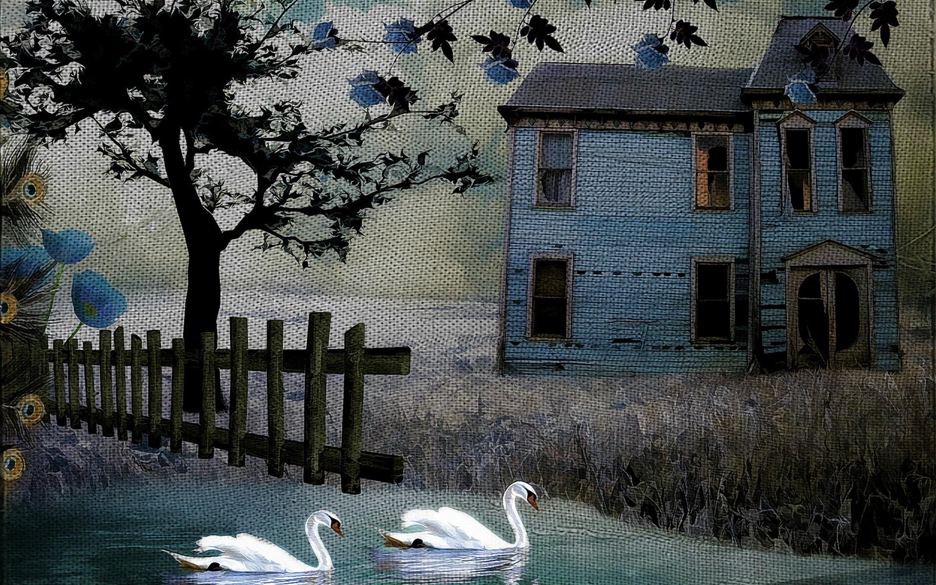 Wallpaper Trees, House, White swans, Swan