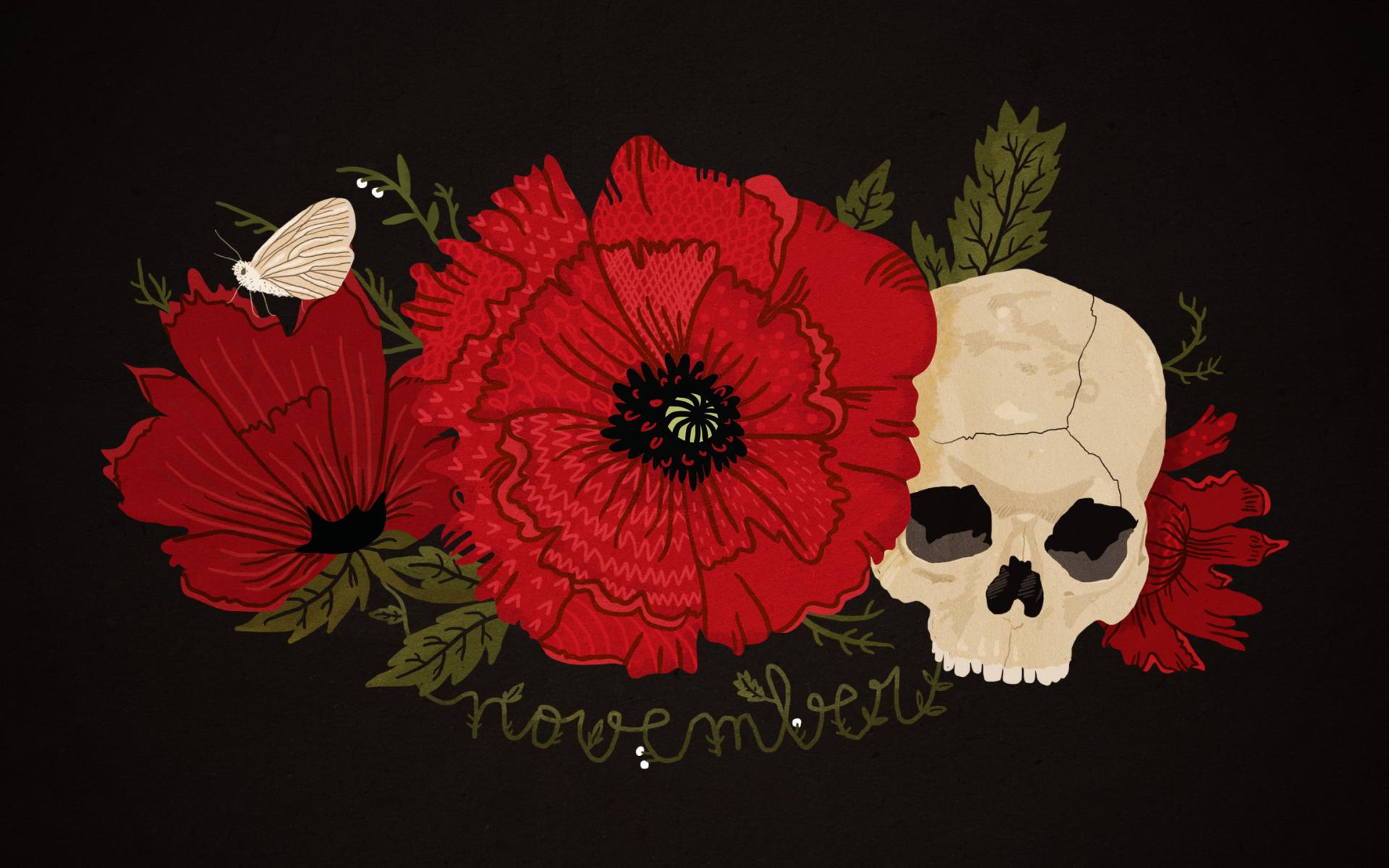 Wallpaper Skeleton, Black background, Butterfly, Poppies, Skull, November