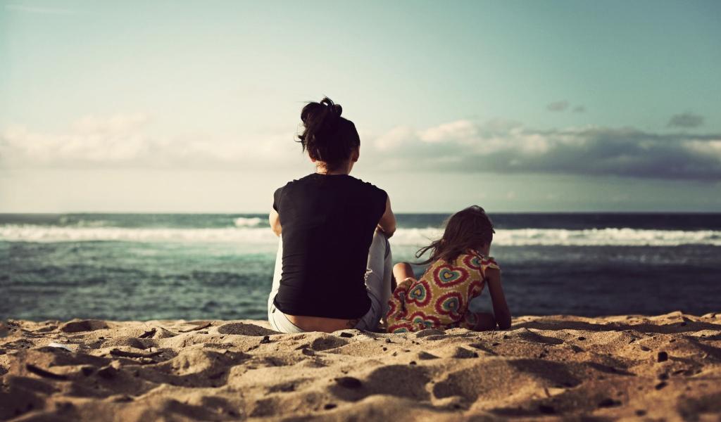 Wallpaper A woman and her daughter sitting in the sand on the beach