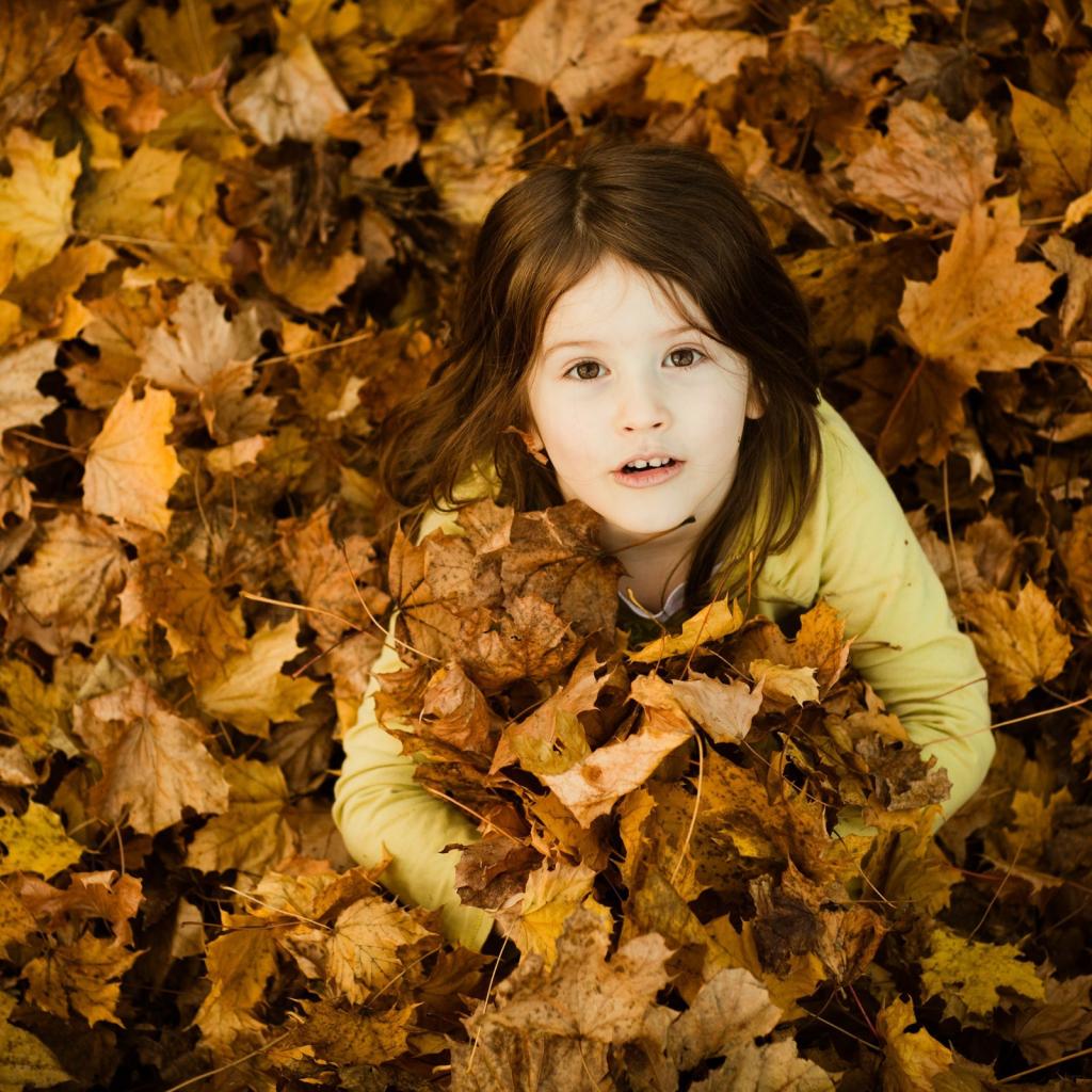 Wallpaper Girl buried in fallen leaves