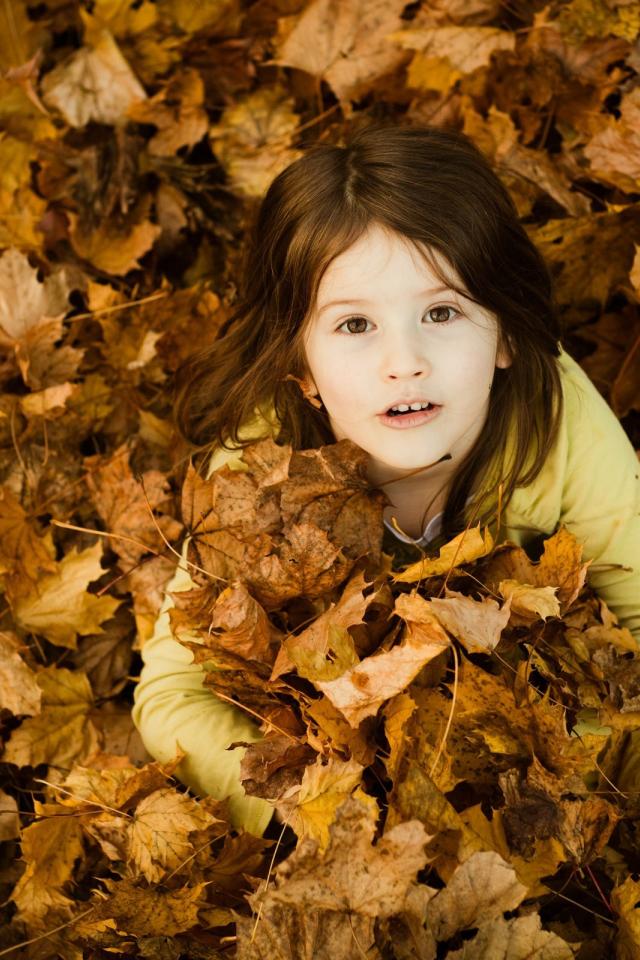 Wallpaper Girl buried in fallen leaves