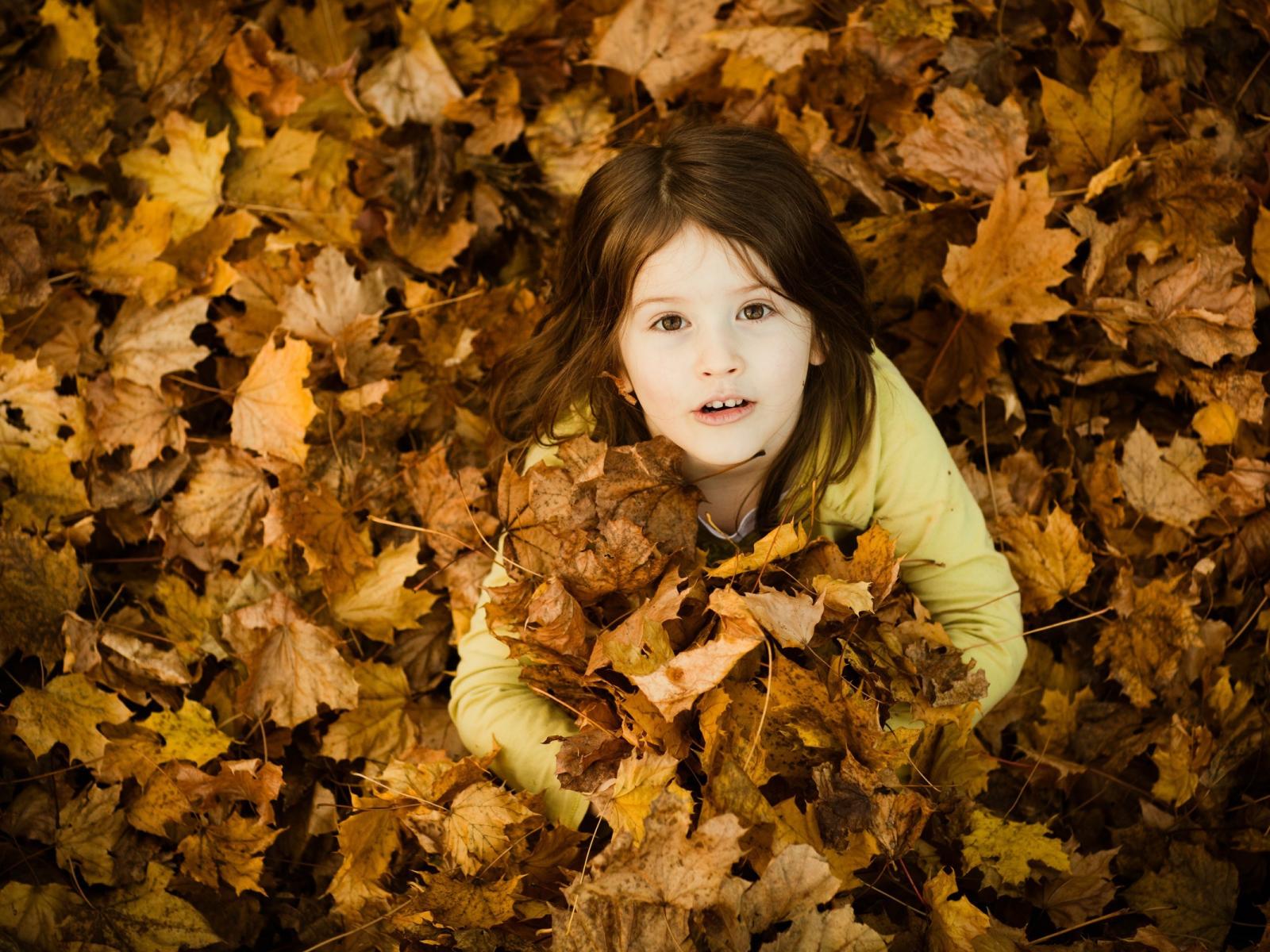 Wallpaper Girl buried in fallen leaves