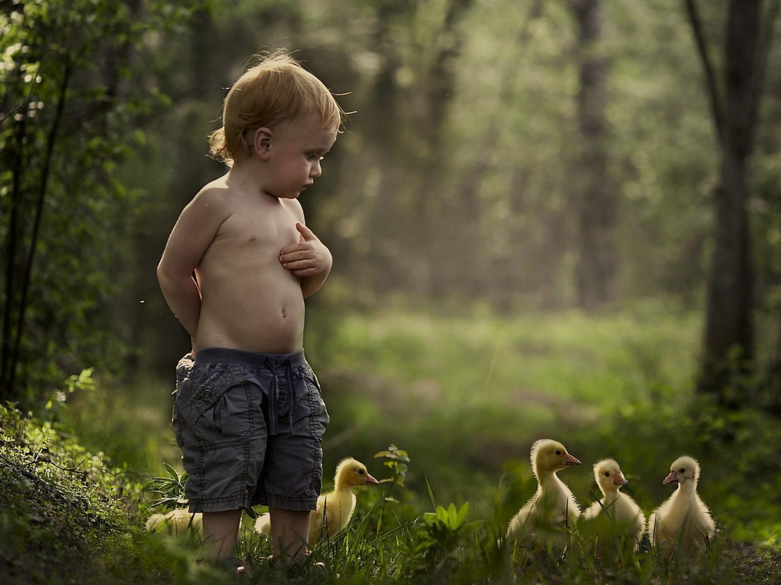 Wallpaper A boy walks among ducklings