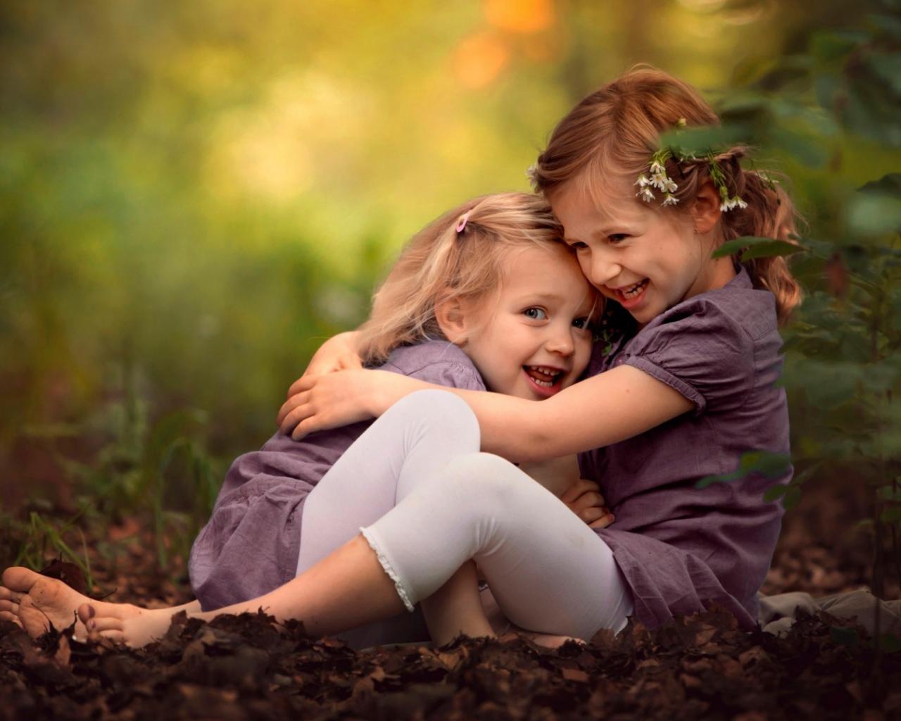 Wallpaper Two cute little sisters playing in the park