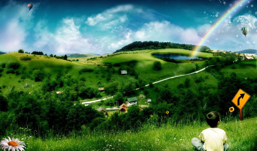 Wallpaper The child looks at a rainbow