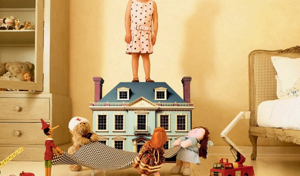 Wallpaper Girl in blue dress sitting on the edge of the roof