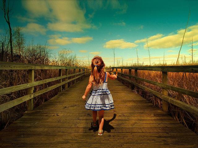 Wallpaper A girl goes on a wooden bridge