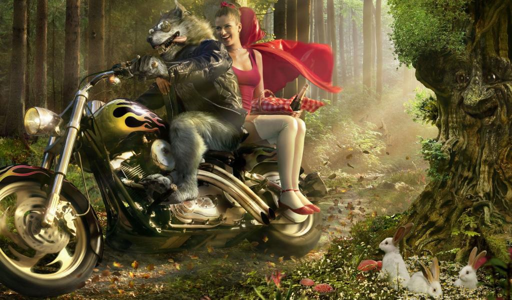 Wallpaper The wolf with the red hat on a motorcycle