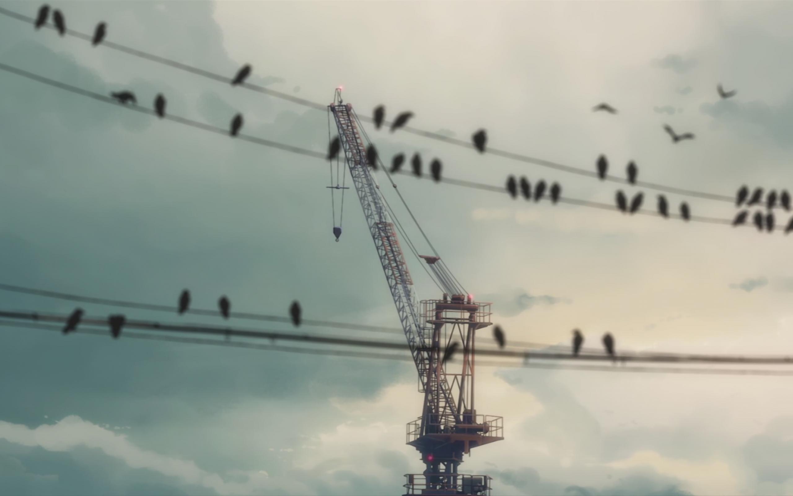 Wallpaper Birds sit on wires on a background of a construction crane