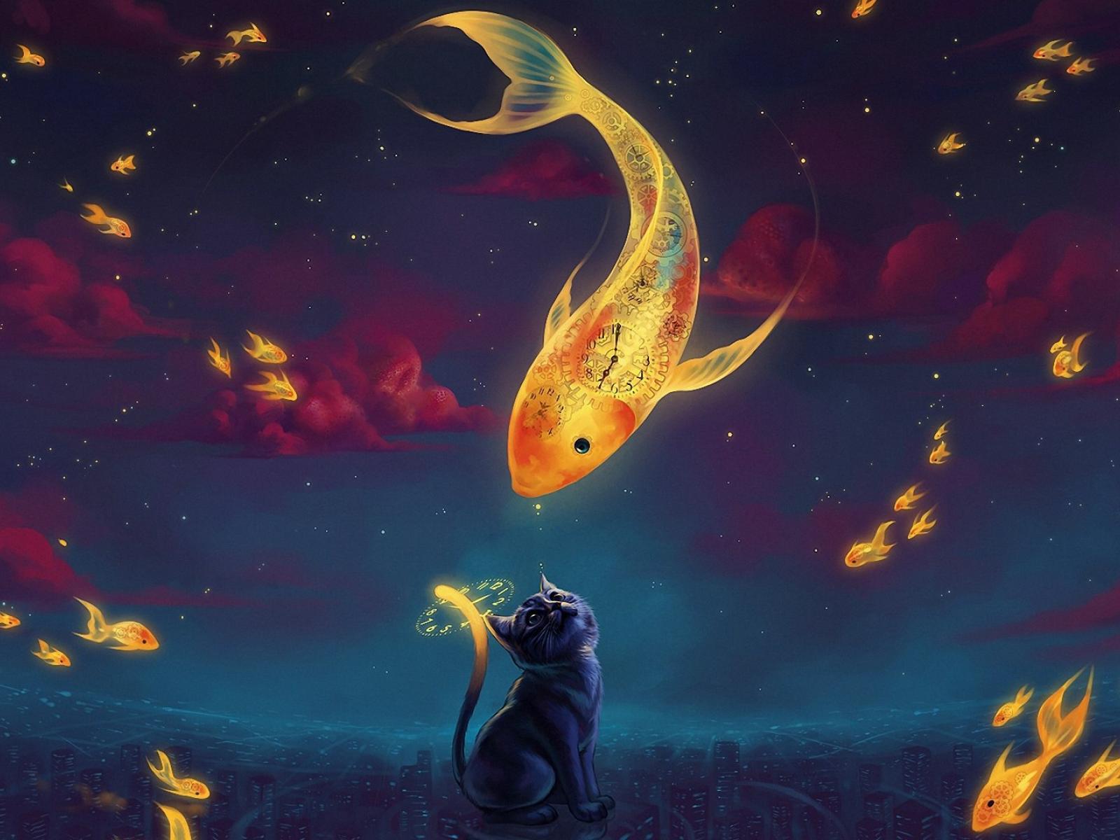 Wallpaper Cat and Goldfish