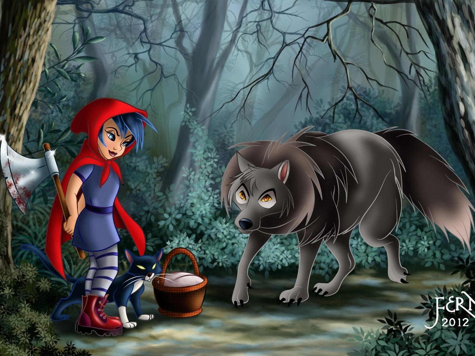 Wallpaper Wolf drinking coffee with Little Red Riding Hood