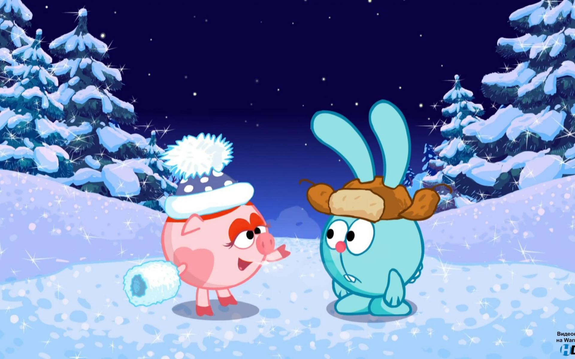 Wallpaper Croche and Nyusha in winter forest in the cartoon Kikoriki