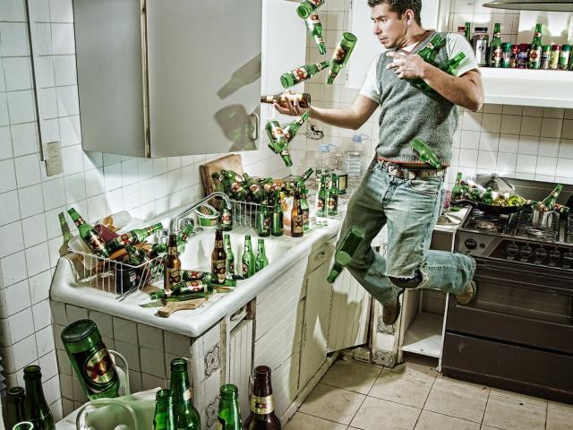Wallpaper A man among the bottles of beer in the kitchen