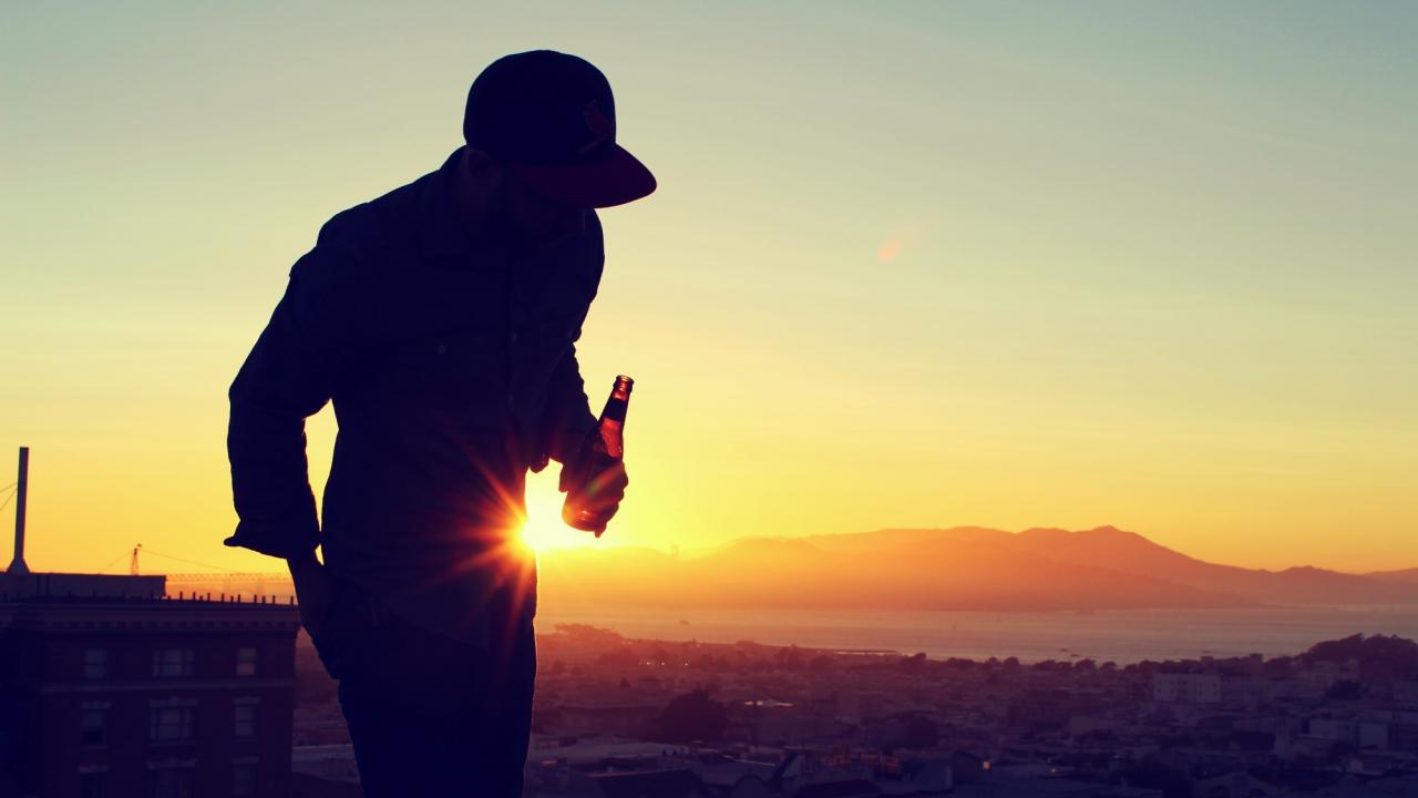Wallpaper Glass of beer among the mountain caps from beer bottles