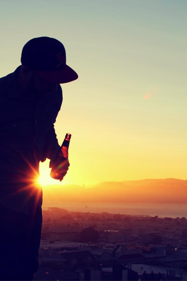 Wallpaper Glass of beer among the mountain caps from beer bottles