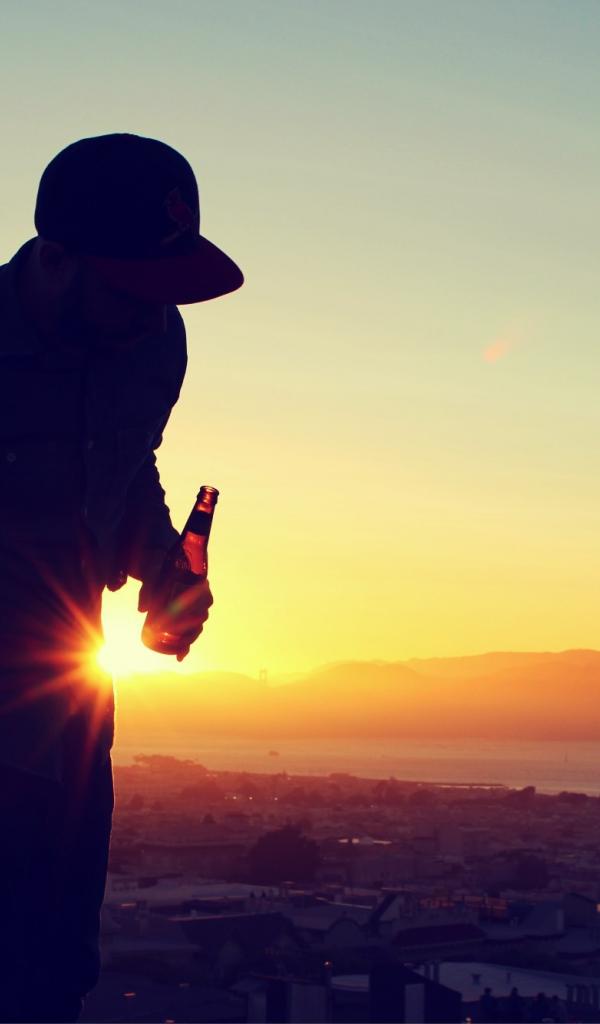 Wallpaper Glass of beer among the mountain caps from beer bottles