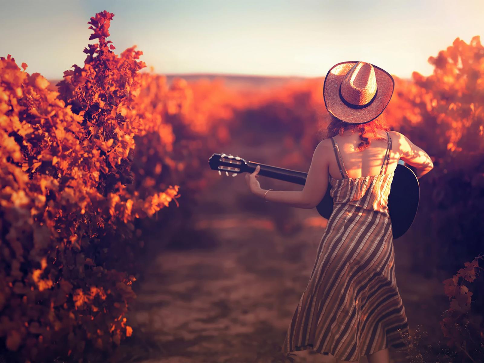 Wallpaper Girl with a guitar in the vineyard