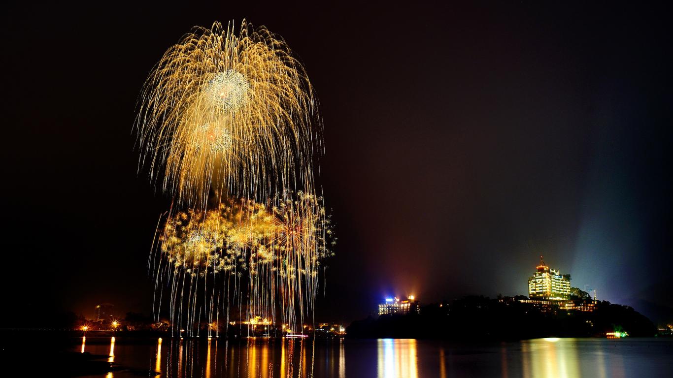 Wallpaper Fireworks is reflected in the water