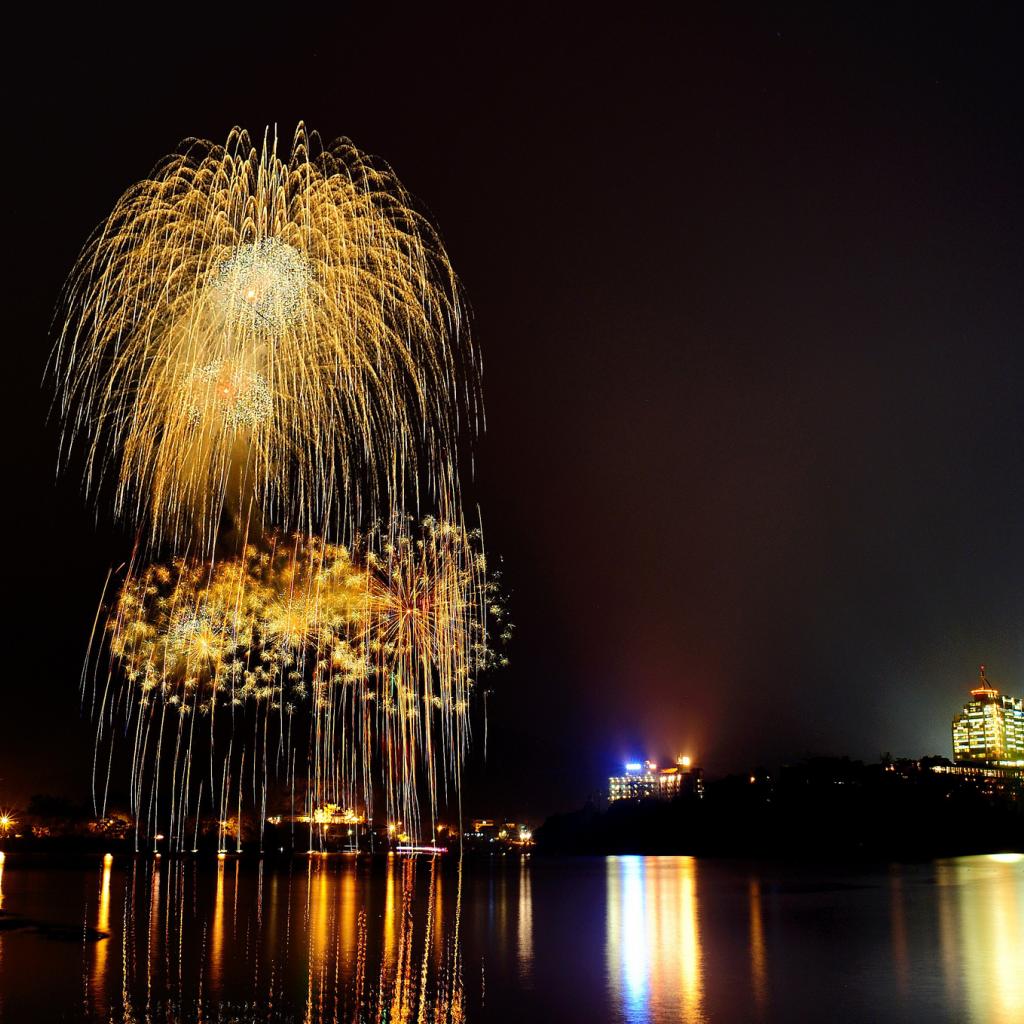 Wallpaper Fireworks is reflected in the water