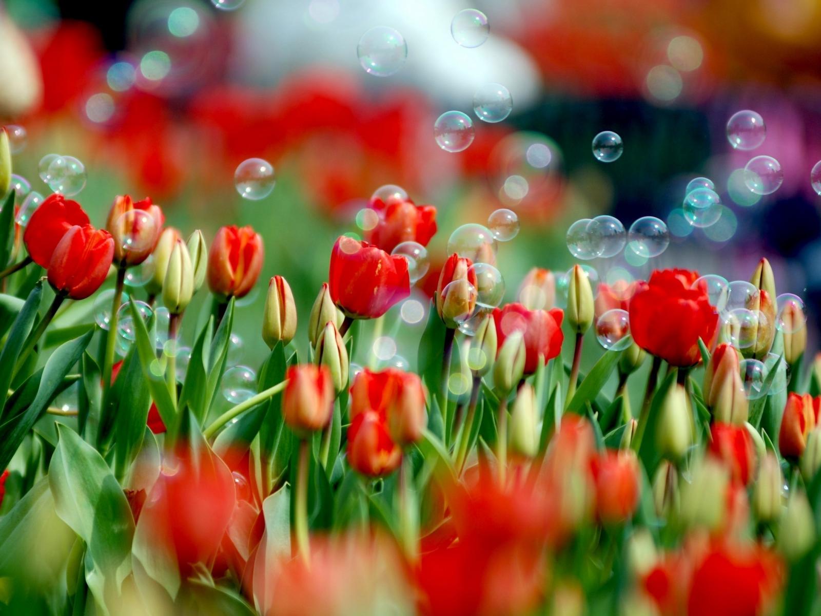 Wallpaper Soap bubbles on red tulips for March 8