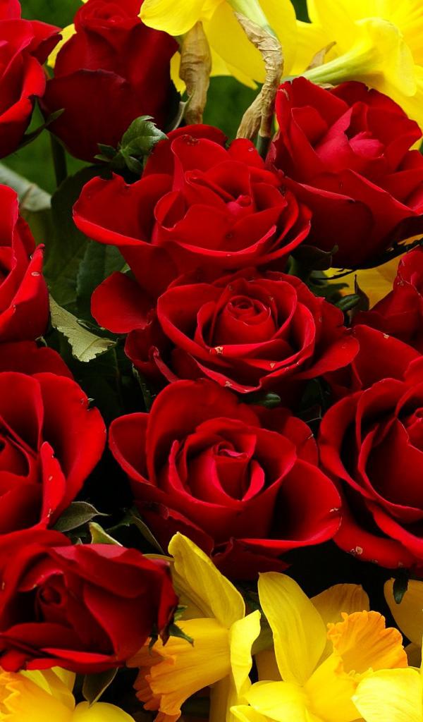 Wallpaper Red roses on March 8 with daffodils