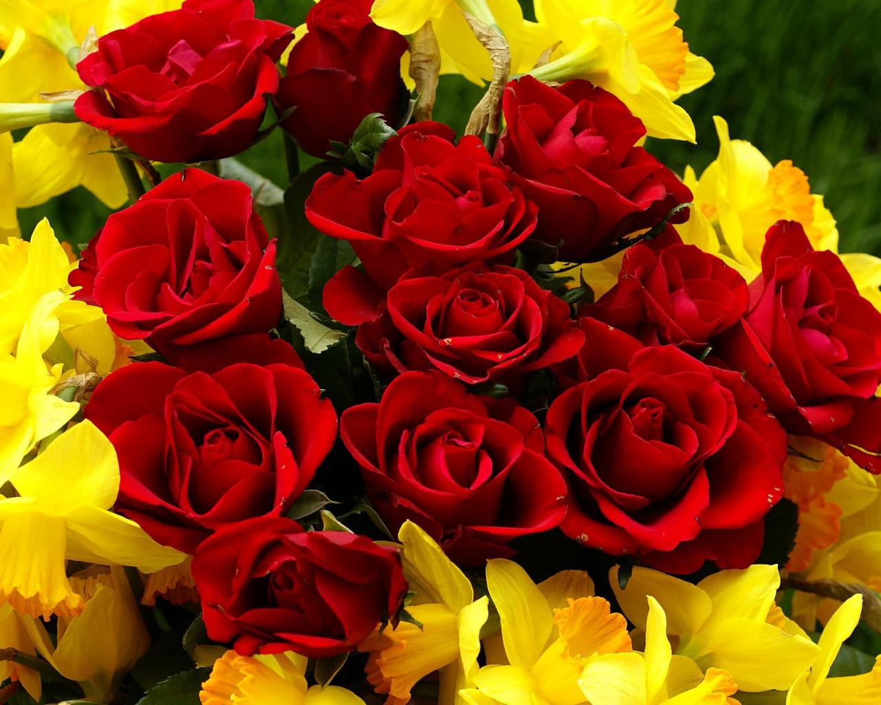 Wallpaper Red roses on March 8 with daffodils