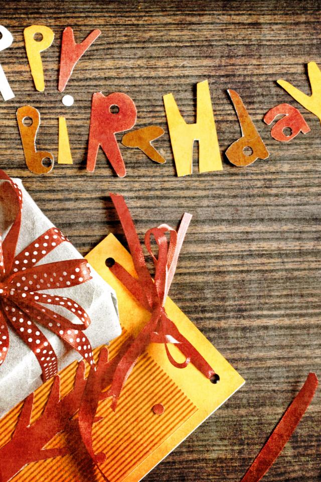 Wallpaper Congratulation with gifts on wooden table on birthday