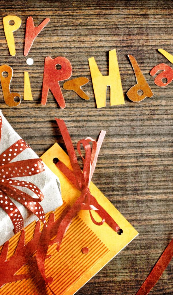 Wallpaper Congratulation with gifts on wooden table on birthday