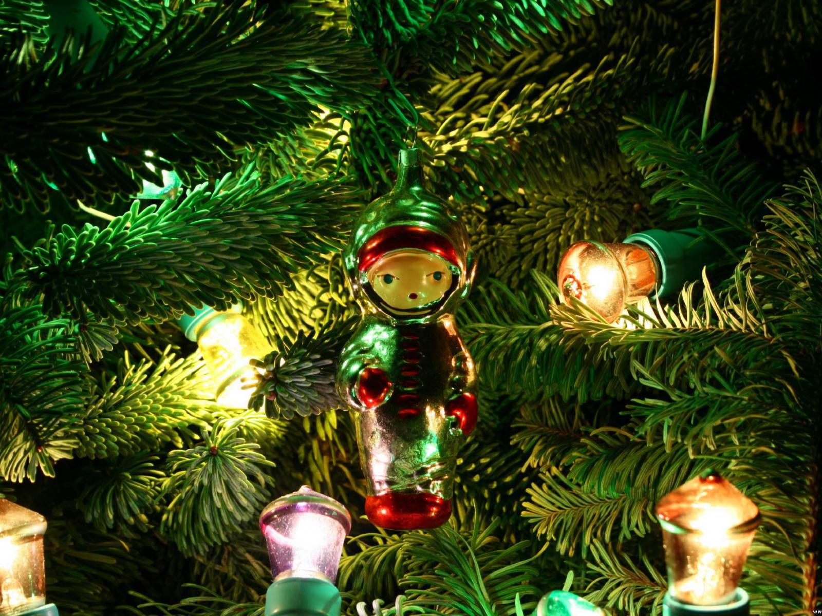 Wallpaper Beautiful Christmas tree with a variety of toys in snowy weather on Christmas