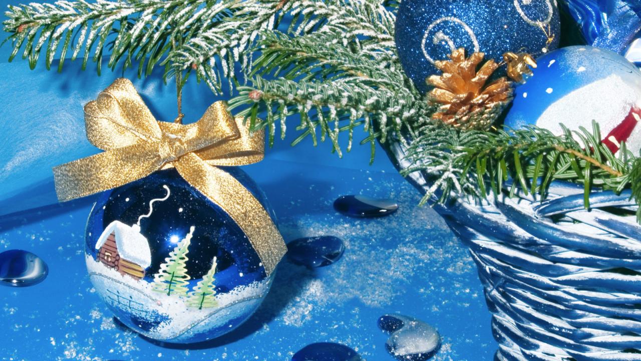 Wallpaper Multi-colored Christmas toys on Christmas, blue background