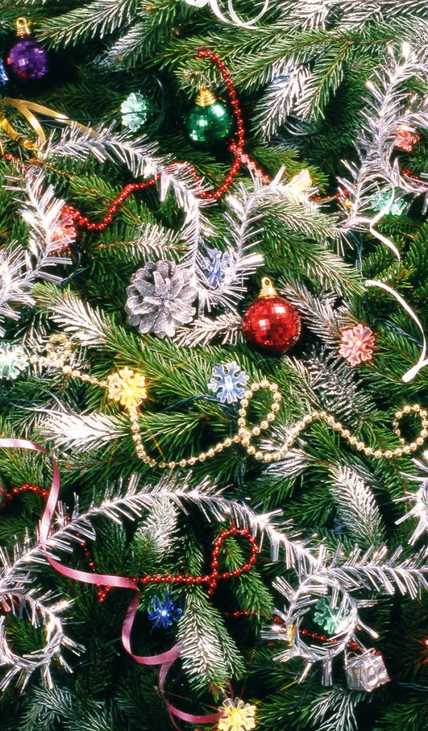 Wallpaper Beautiful Christmas tree with a variety of toys in snowy weather on Christmas