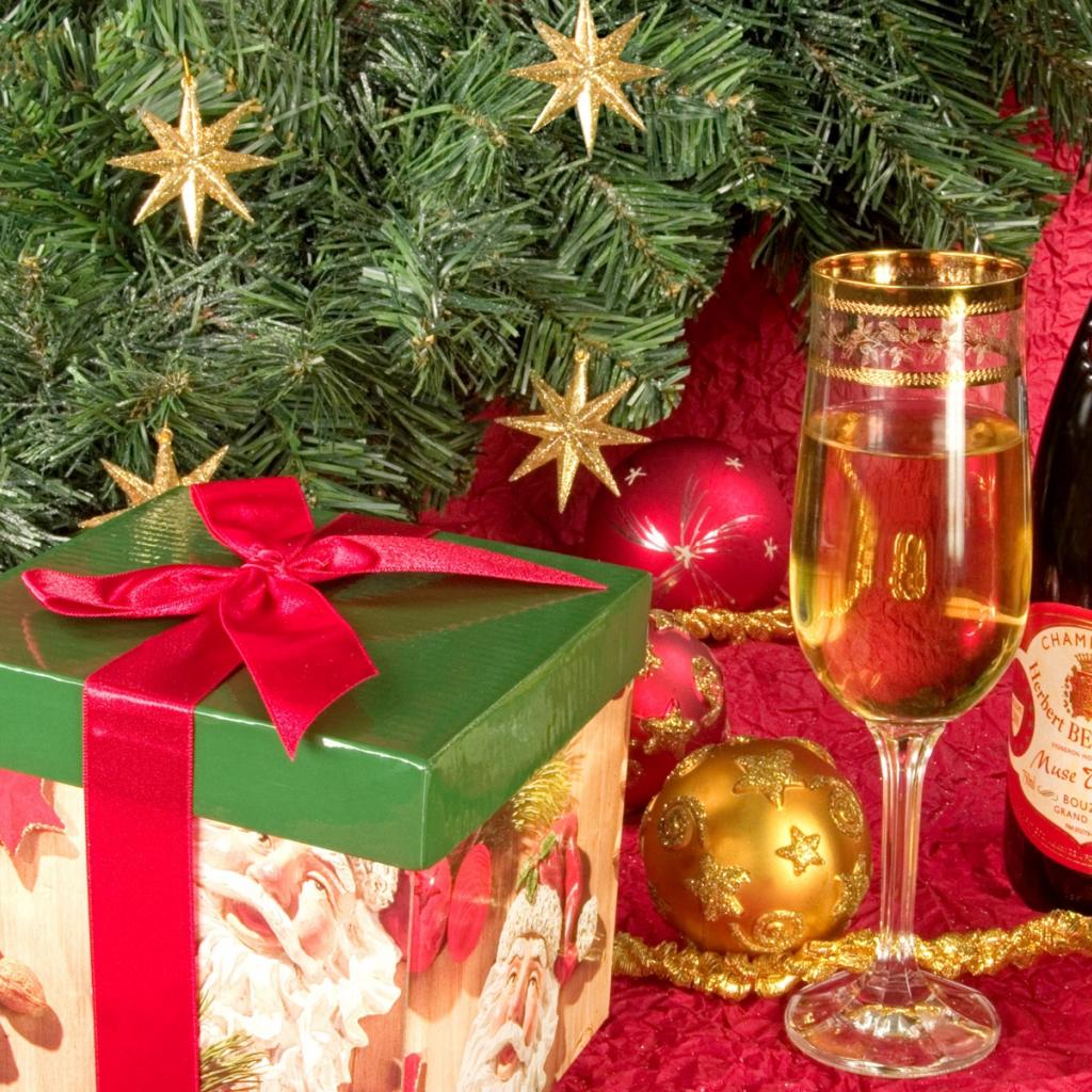 Wallpaper New year tree gifts champagne