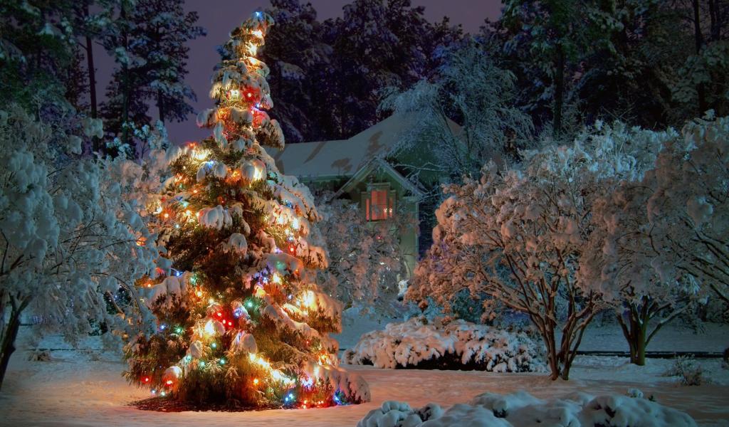 Wallpaper Christmas tree in the snow and lights