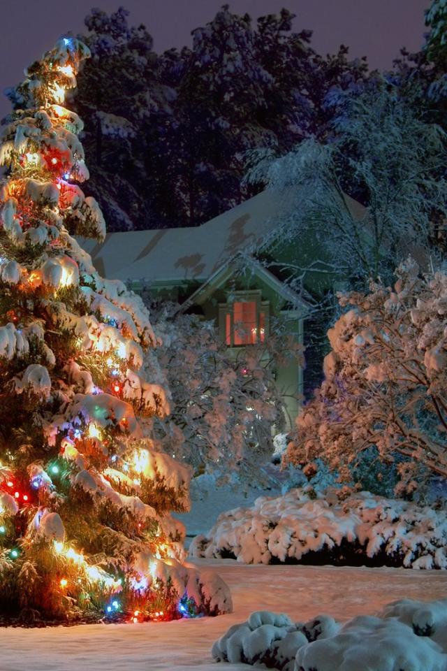 Wallpaper Christmas tree in the snow and lights