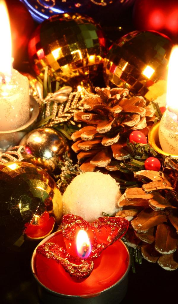 Wallpaper Candles, pine cones and Christmas tree decorations