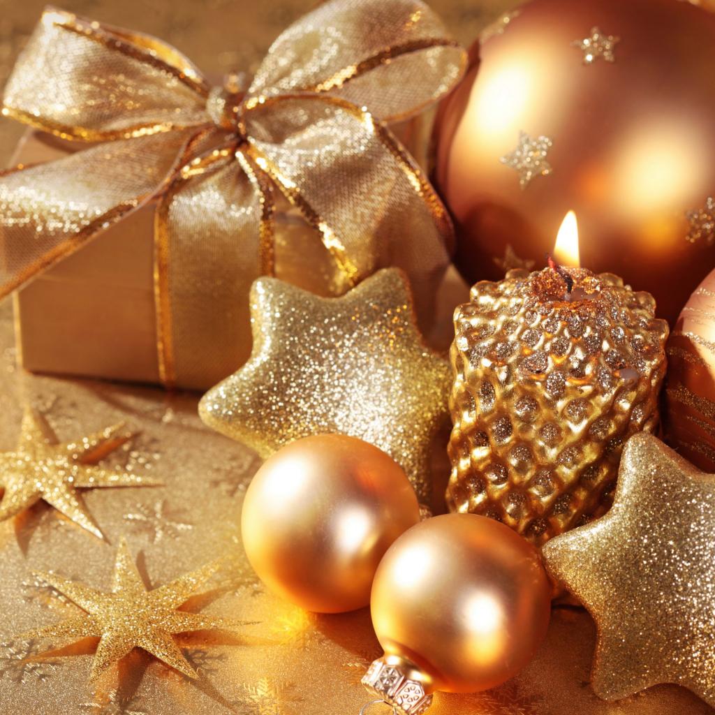 Wallpaper Gift, Red ribbon, A glass of champagne, Balls, Candles , Christmas tree, Santa Claus, Christmas toys, Christmas garland