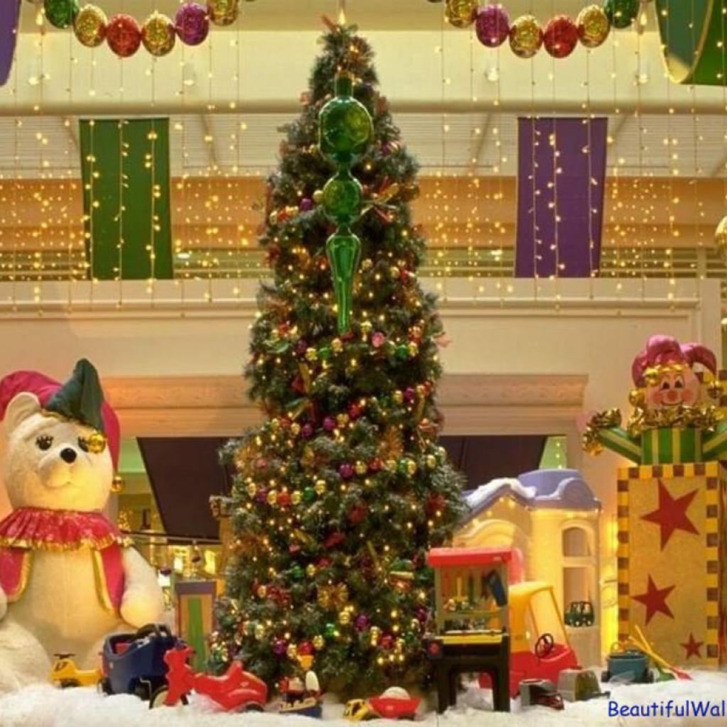Wallpaper Beautiful Christmas tree with a variety of toys in snowy weather on Christmas