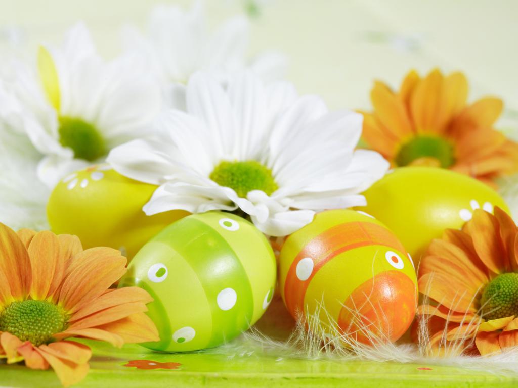 Wallpaper Eggs on the background of yellow flowers for Easter