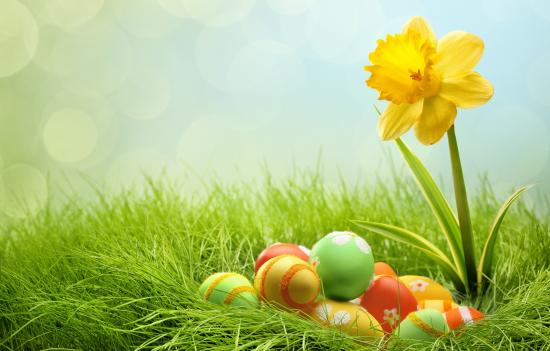 Wallpaper Eggs on the background of yellow flowers for Easter