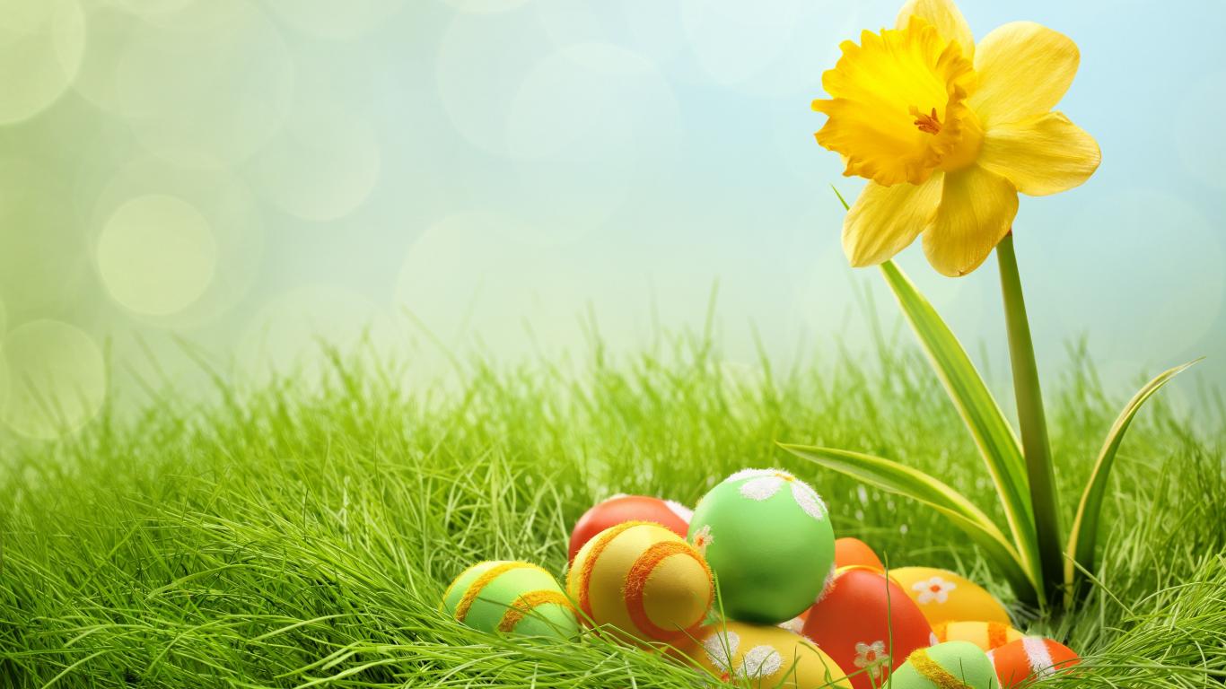 Wallpaper Eggs on the background of yellow flowers for Easter