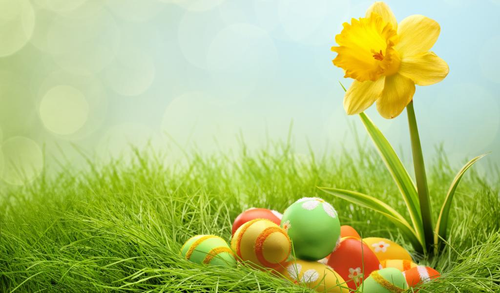 Wallpaper Eggs on the background of yellow flowers for Easter