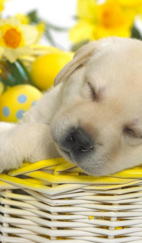 Wallpaper Puppy in a basket of eggs for Easter