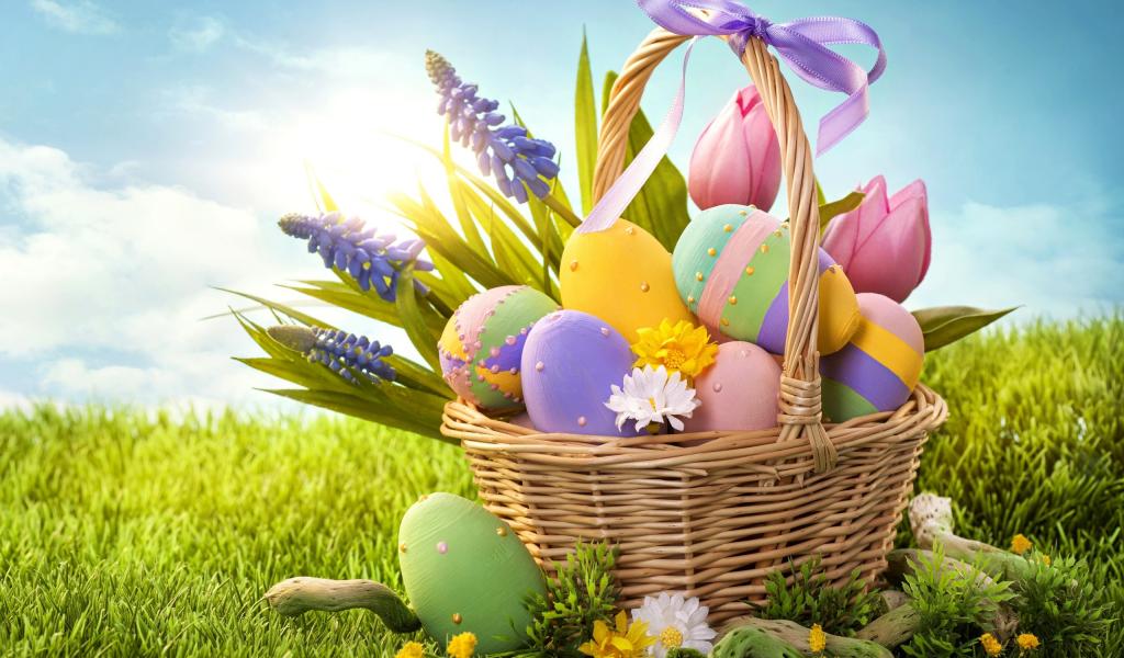 Wallpaper Basket of eggs on the background of the sky on Easter