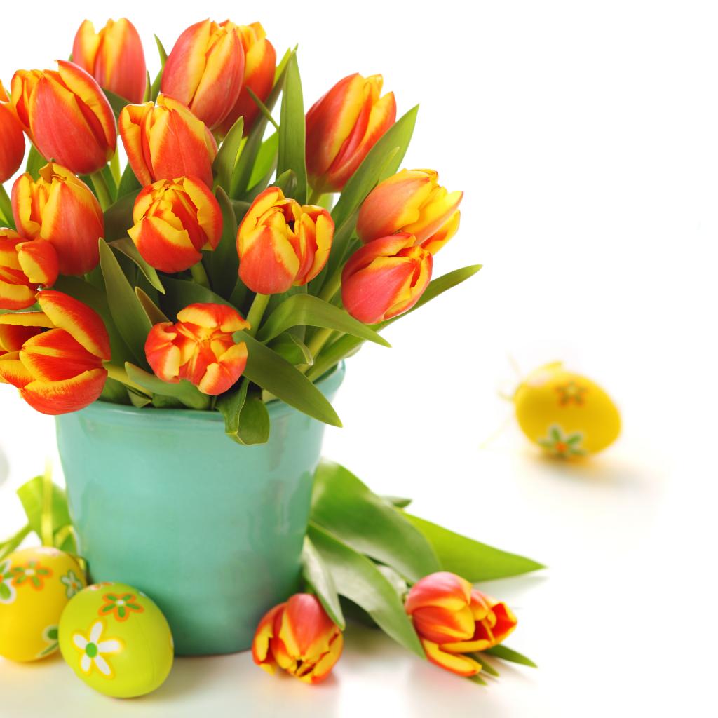 Wallpaper Basket of eggs on the background of tulips for Easter