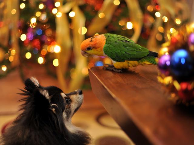 Wallpaper The dog and parrot Christmas meet