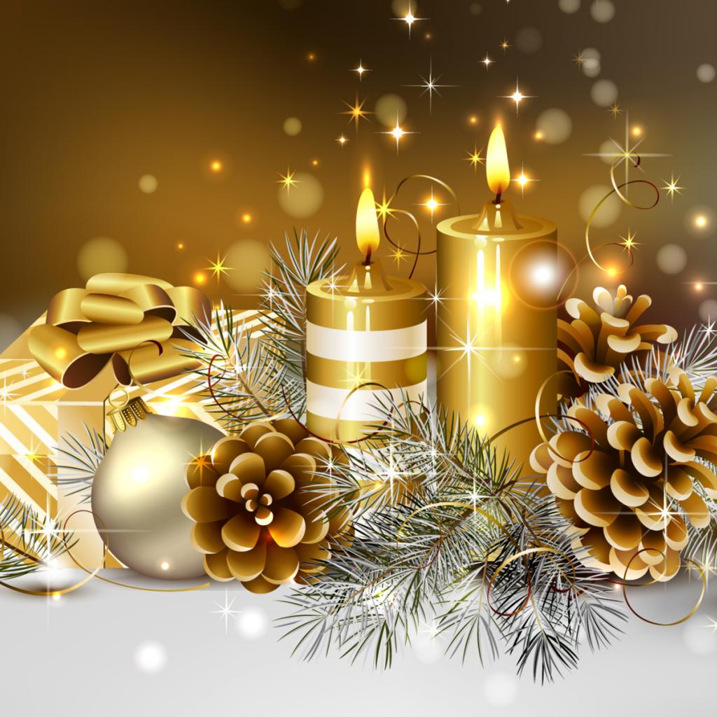 Wallpaper Gift, Red ribbon, A glass of champagne, Balls, Candles , Christmas tree, Santa Claus, Christmas toys, Christmas garland