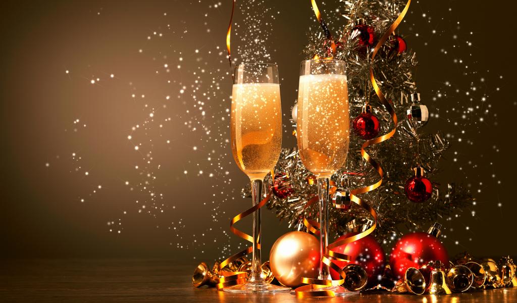 Wallpaper Gift, Red ribbon, A glass of champagne, Balls, Candles , Christmas tree, Santa Claus, Christmas toys, Christmas garland