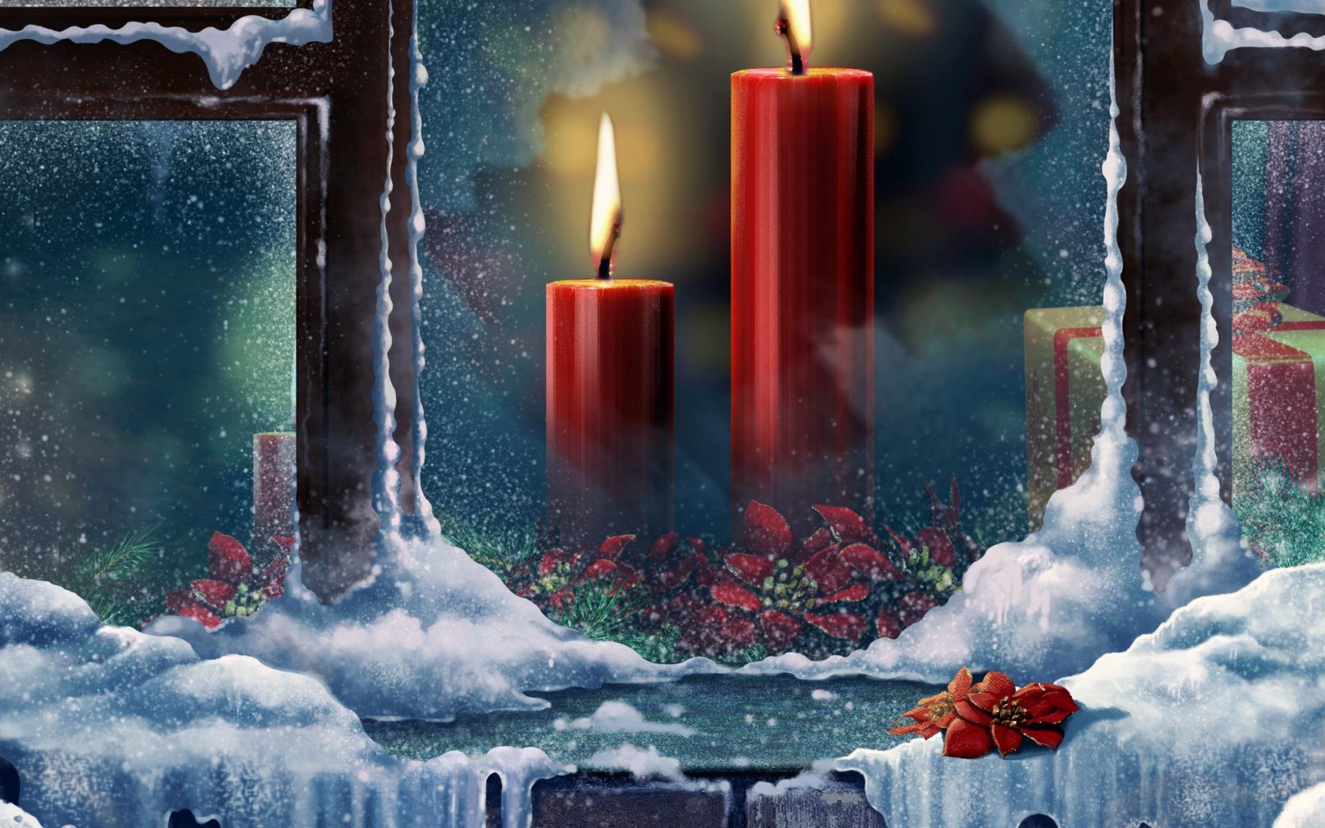 Wallpaper Burning candles outside the window on Christmas